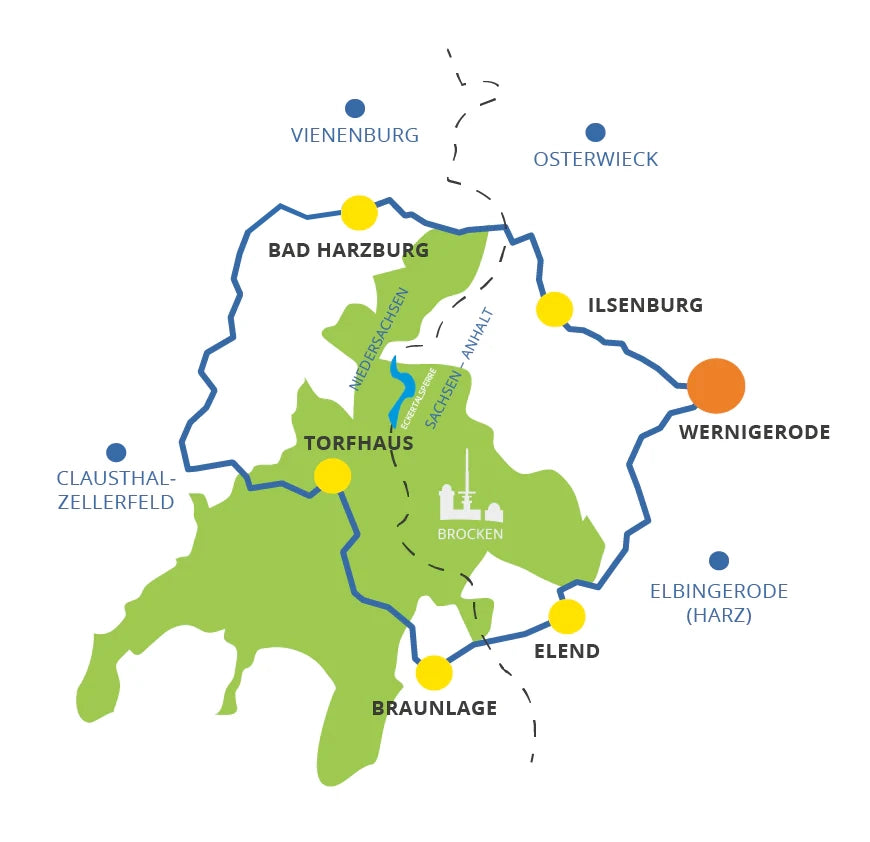 11.00 Uhr starten wir am Schlossparkplatz Anger in Wernigerode. Wir umfahren den Brocken, sie erblicken den Blocksberg aus jeder Himmelsrichtung und alle Seiten des Nationalparks Harz. Die Fahrt beginnt in Richtung Ilsenburg über Drübeck. In dem malerischen kleinen Städtchen lernen sie das Ilsenburger Kloster und die Innenstadt kennen. Weiter geht es in Richtung Bad Harzburg über den ehemaligen Grenzübergang Eckertal. Entlang an der ehemaligen Luftwaffenmunitionsanstalt kommen wir in Bad Harzburg am Burgberg an. Aufenthalt im "Tor zum Harz" Bad Harzburg. Vielleicht fahren sie mit der historischen Burgberg-Seilbahn von 1929 auf den Burgberg oder trinken einfach eine Tasse Kaffee in der Bummelallee. Anschließend geht die Fahrt entlang am Radauwasserfall und der Rabenklippe in Richtung Torfhaus. Dort angekommen, erfolgt der nächste Stopp auf 821 m ü.NN. Hier genießen wir einen wundervollen Blick auf den Brocken, erkunden das Torfhaus und haben im Anschluss daran die Möglichkeit einzukehren*. Die Bavaria Alm lockt mit leckeren Speisen und Getränken. Frisch gestärkt fahren wir weiter über die höchstgelegene und beeindruckendste Panoramastraße im Harz in Richtung Braunlage. Braunlage, das Herz des Oberharzes, hat sich in den letzten zehn Jahren zu einer sympathischen kleinen Stadt gemausert. Nicht nur der Wurmberg mit seinen 971 m ü.NN., sondern auch die entzückende Innenstadt laden zum Verweilen ein. Lernen Sie Braunlage kennen und besuchen sie gern das kleine Harzmuseum. Zum Abschluss geht es auf die Hexenrittalm zu Kaffee und Kuchen. Gegen 16.30 Uhr setzen wir uns wieder in Bewegung Richtung Schierke und Wernigerode. In Schierke, das „St. Moritz des Nordens“ oder der „Kurort der Werktätigen“, genießen sie eine kleine Rundfahrt, die „Feuerstein Arena“ und die alte Apotheke „Zum Roten Fingerhut“. Den Schierker Feuerstein verkostet und alle Magenbeschwerden beseitigt, fahren wir weiter über Drei Annen Hohne zurück nach Wernigerode. Als Abschluss möchten wir erwähnen, dass das Herz des Harzes - der Blocksberg - unser Brocken, einmal umrundet wurde.